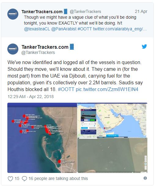 ويذكر التقرير أن موقع "TankerTrackers"، الذي يتبع خط السفن، ومقره السويد، لاحظ وجود ناقلات بعد ساعات من تغريدة السفير، ومن خلال صور التقطت في الفضاء وتحويل البيانات حددت المجموعة عددا من القوارب الراسية على ميناء الحديدة، وتم البدء بمراقبة حركتها، مشيرا إلى أنه جاء في التغريدة التي نشرها الموقع: "لقد حددنا وسجلنا القوارب المذكورة كلها، وفي حال تحركها فإننا نعلم ذلك، وكلها جاءت من الإمارات العربية المتحدة عبر جيبوتي، وتحمل الوقود للسكان".