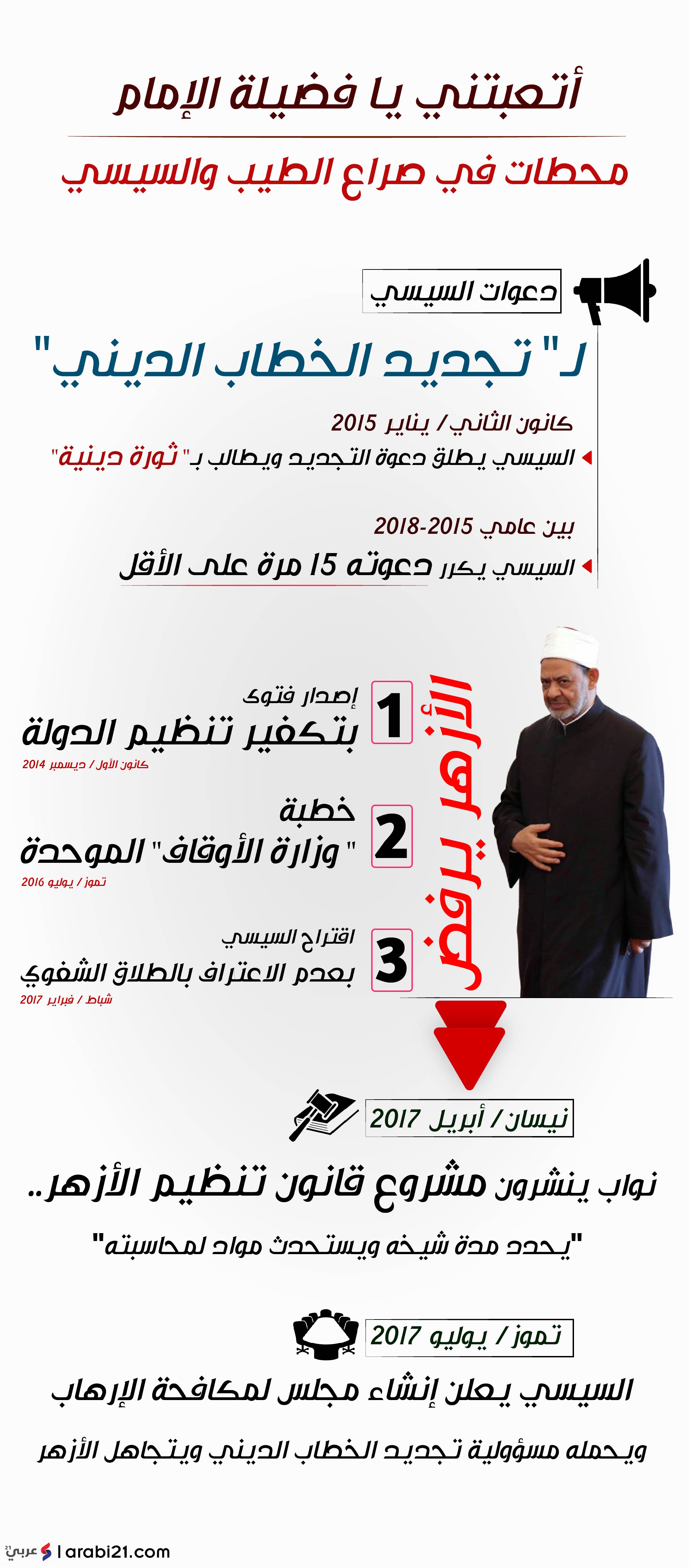 وأطلق السيسي ما سماه دعوته لـ"تجديد الخطاب الديني" في كانون الثاني/ يناير 2015، وطالب بـ"ثورة دينية"؛ لتصحيح ما قال إنها مفاهيم مغلوطة في الإسلام ورثها ملايين المصريين، وكررها أكثر من 15 مرة، في ظل عدم استجابة واضحة من الأزهر الشريف لدعوته، تنم عن عدم رضى الأزهر لنهج السيسي في محاولته هدم السنة أو النيل منها أو التشكيك فيها.