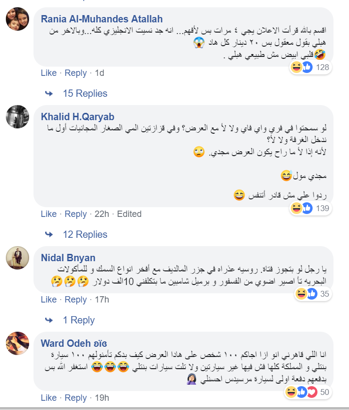 وذكر فندق "Fairmont Amman"، أن أحد عروضه لإحياء هذا اليوم بالنسبة لشخصين، يكلف 20 ألف دينار (28.2 ألف دولار).