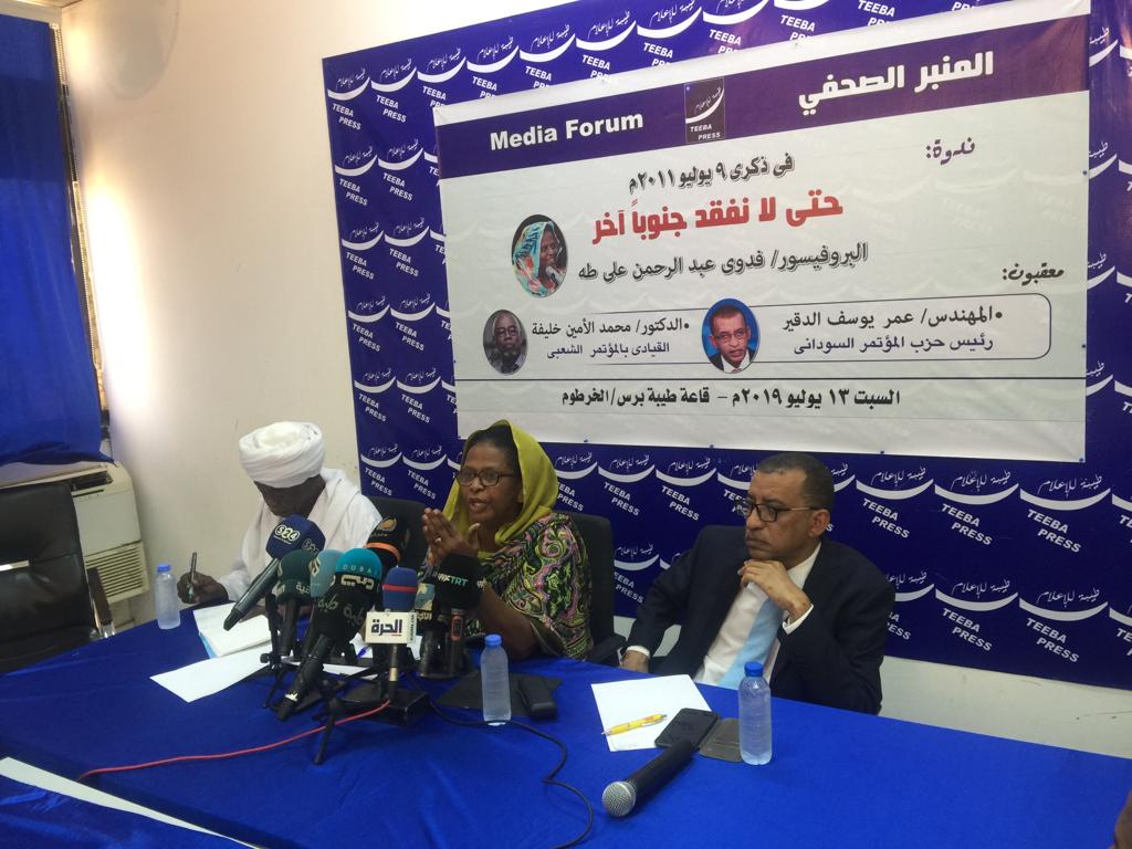 وقدمت طه، فكرة تاريخية عن تاريخ انفصال الجنوب منذ ما يعرف بقانون المناطق المقفولة في العام 1946، فضلا عن مؤتمر المائدة المستديرة في العام 1951 والذي أتاح فرصة تواصل جنوب السودان مع الشمال وفقا لقرار المستعمر البريطاني، بينما كانت قضية الفديرالية واحدة من الأمور المرحلة على مر العهود والحكومات التي تعاقبت على حكم السودان.
