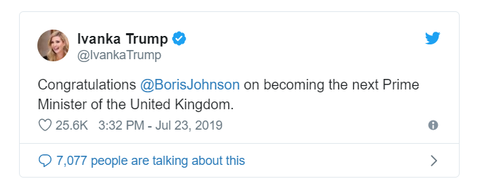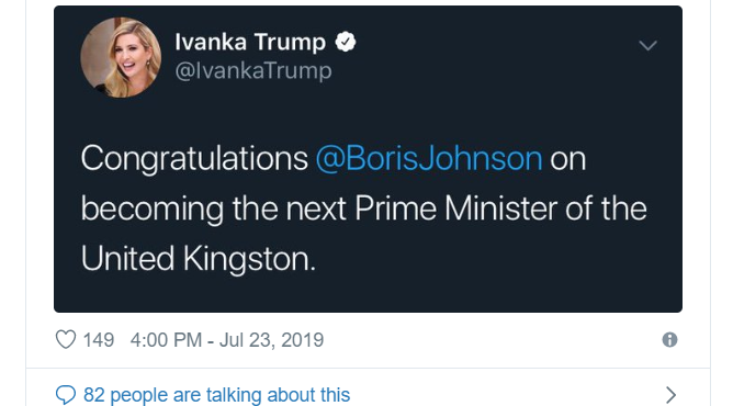 وتورد المجلة نقلا عن إيفانكا، قولها في التغريدة: "تهانينا بوريس جونسون على انتخابك رئيس الوزراء المقبل ليونايتد كينغستون".