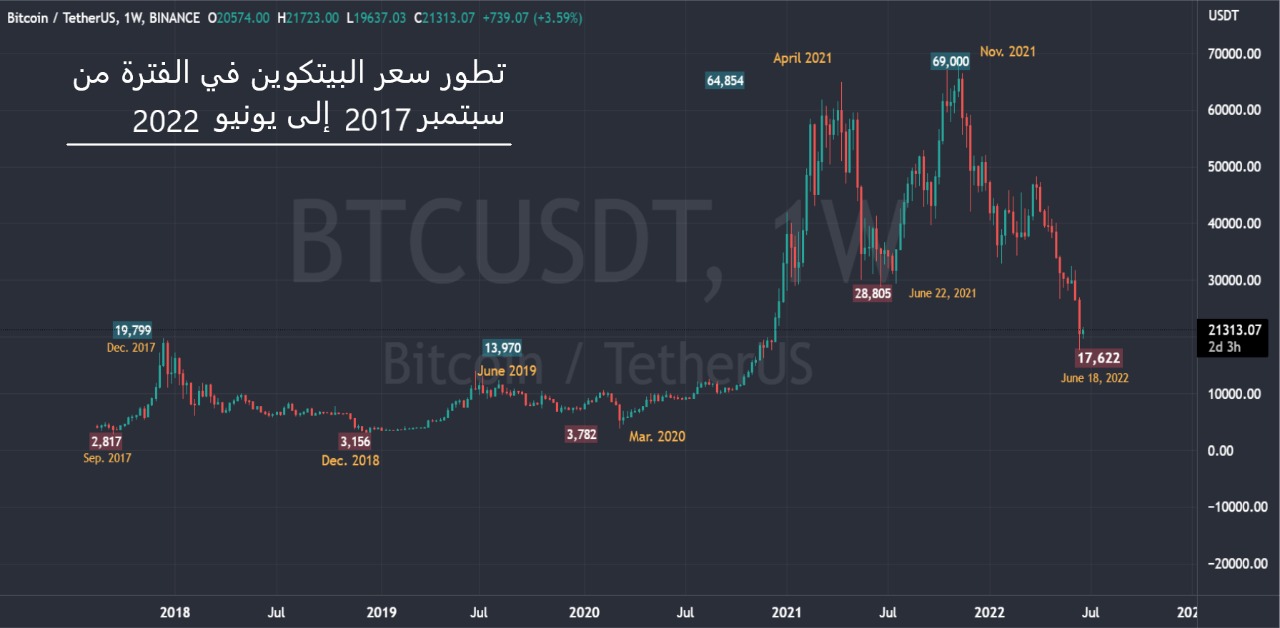 الاستثماري الخطر بشكل كامل، وهذا ما يفسر حالة التراجع في قيمة بتكوين والتي تعتبر مقياسا لبقية العملات المشفرة الأخرى، وبالتالي فإنه إذا تراجع سعرها فسيتراجع سعر البقية".
