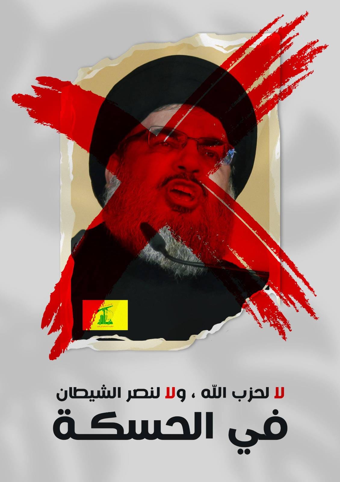 للأمين العام لحزب الله اللبناني حسن نصر الله، وبجانبها نص بيان، تضمن عبارات رفض