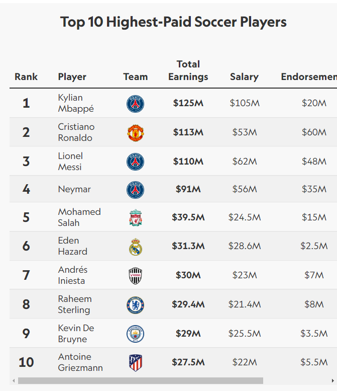 وبحسب الموقع، فإن بطل العالم، نجم باريس سان جيرمان كيليان مبابي، يتصدر القائمة بدخل إجمالي يصل إلى 125 مليون دولار، موزعة على 105 ملايين كرواتب، و20 مليونا كمكافآت وملحقات بتفاصيل العقد.