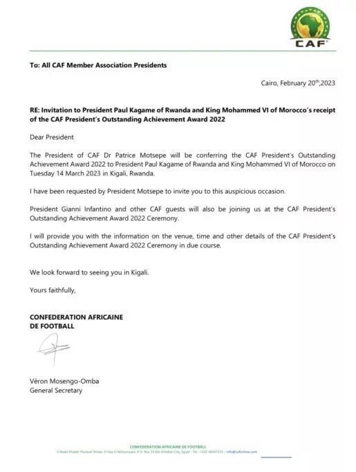 ودعا الاتحاد القاري عن طريق رئيسه الجنوب أفريقي، باتريس موتسيبي، العاهل المغربي ورئيس رواندا إلى الحضور لهذا الحفل لتسلم الجائزة الشرفية، والذي تحتضنه كيغالي الشهر المقبل.