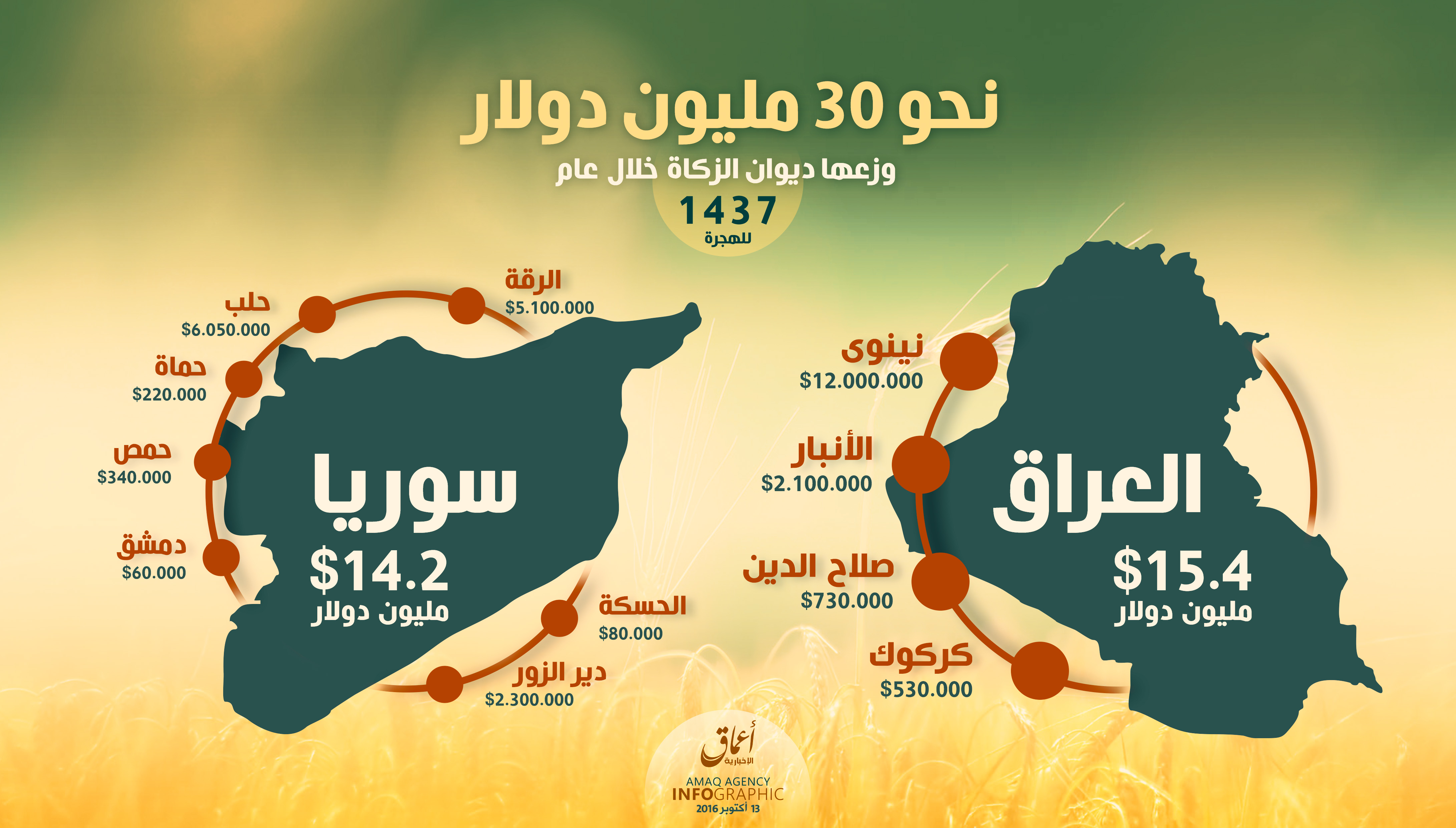 ووفقا لـ"أعماق"، فإن 15.4 مليون دولار تم توزيعها في العراق، مقابل 14.2 مليون دولار وُزّعت في سوريا.