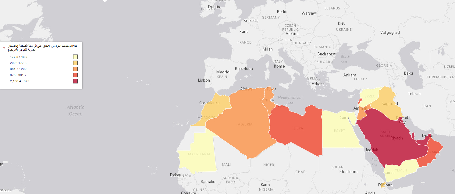 عربي21"، فقد جاءت قطر في مقدمة الدول بالإنفاق على الرعاية الصحية على مواطنيها بواقع 2106 دولارات للفرد الواحد بحسب آخر بيانات متوفرة لدى البنك لعام 2014 في حين حلت موريتانيا أخيرا بواقع 48.8 دولارا.